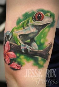 肩部彩色青蛙与花朵纹身图案