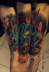 小腿五彩的神秘亚洲东方式龙头与花朵纹身图案