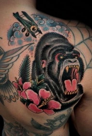 背部黑色的大猩猩与粉红色的花朵纹身图案