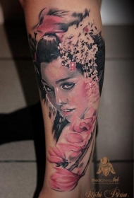 小腿逼真的彩色美丽亚洲女性肖像和花朵纹身图案