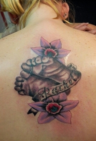 漂亮的两朵粉色花朵和婴儿脚印纹身图案