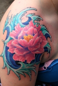 肩部粉红色的日本花朵和波浪纹身图案
