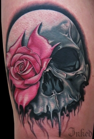 手腕彩色骷髅与粉红玫瑰纹身图案