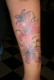 小腿粉红色的卡通火烈鸟与花盆纹身图案