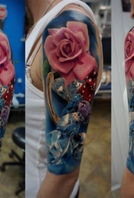 肩部漂亮的彩色色玫瑰与钻石纹身图案