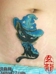 美女腹部潮流的图腾猫咪五角星纹身图片