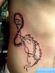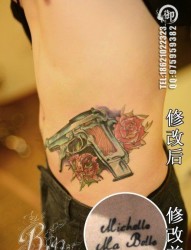 女人腹部漂亮精美的玫瑰花与钥匙纹身图片