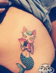 美女腹部时尚可爱的猫头的美人鱼纹身图片