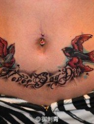 一幅女人腹部燕子字母纹身图片由纹身520图库推荐