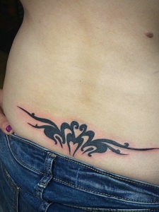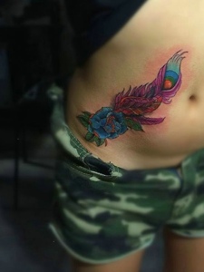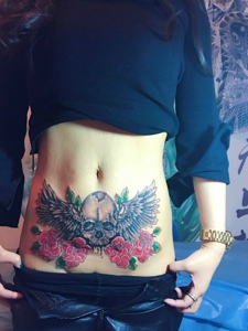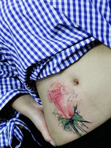 遮盖疤痕的腹部泼墨花朵纹身刺青