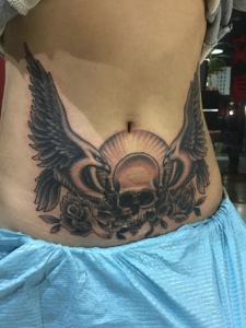 遮盖女性妊娠纹的彩色骷髅纹身图案