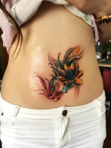 能够遮盖疤痕的腹部彩色羽毛纹身图案