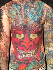 肚子上大骷髅头骨满胸大鸟纹身图案