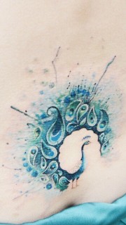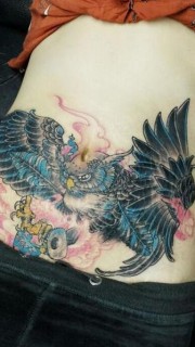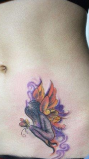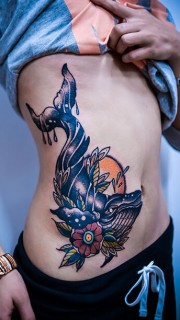 女生腰部宝蓝色灵动鲸鱼纹身图案