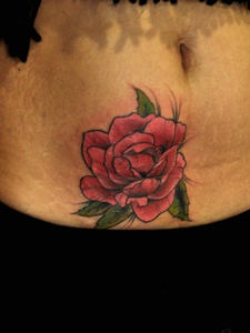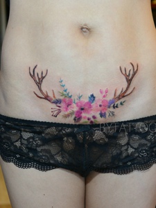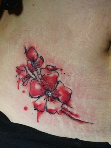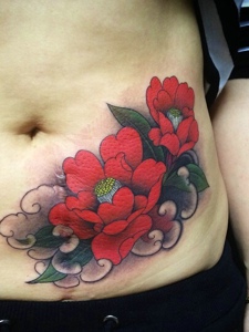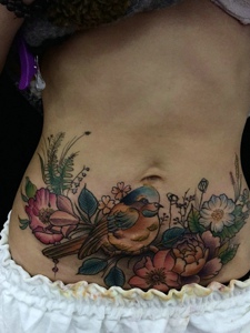 遮盖着旧疤痕的喜鹊和花朵腹部纹身