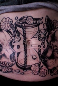 腹部黑色狗头部骷髅沙漏花朵纹身图案