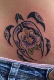 腹部彩色部落龟和木槿花纹身图案