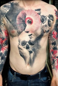 胸部骷髅与写实女子肖像纹身图案