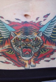 腹部愤怒出火焰的翅膀老虎纹身图案