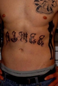 男子腹部邪恶的女孩和花体字母纹身图案