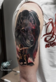 手臂彩色战犬与士兵纹身图案