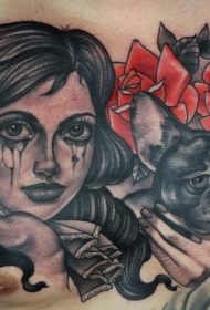 胸部old school彩色哭泣女人与狗和花朵纹身图案