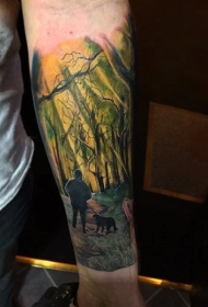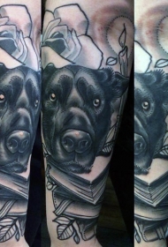 印象非常深刻的黑色狗与书籍手臂纹身图案