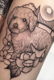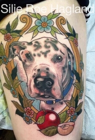 大腿手绘风格彩色的狗花朵和苹果纹身图案