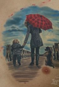 胸部彩色男性与儿童和狗在海洋码头纹身图案