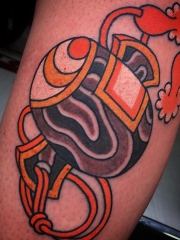 手臂点刺风格黑色骷髅和鼓棒纹身图案