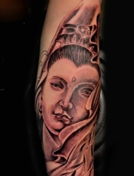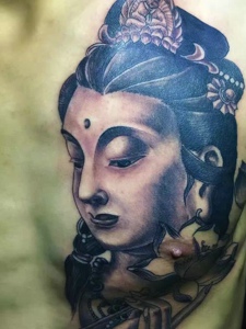 女子正背上的精致的黑色细线条风格观音纹身图片