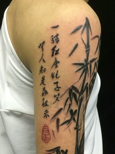 山竹与汉字结合的大臂纹身图片