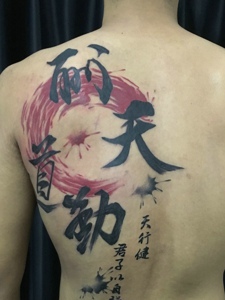 背部彩色汉字泼墨纹身图案