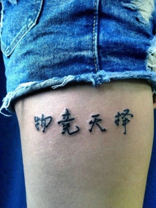 大腿上的个性汉字单词纹身图案