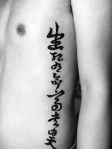 生死在命富贵由天的侧腰部泼墨汉字纹身