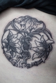女生侧腰上黑白点刺植物抽象线条花朵纹身图片