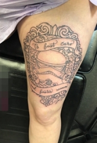 男生侧腰上黑白抽象线条花体英文纹身图片