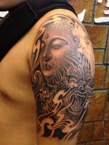 佛像和鲤鱼结合的黑白半甲纹身