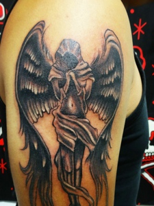 另类的天使与恶魔结合的大臂图腾刺青