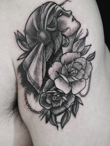 大臂一枚黑白美女肖像纹身