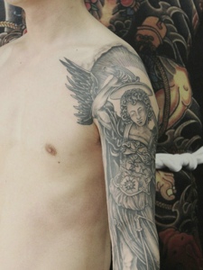 手臂黑白天使纹身图片个性十足