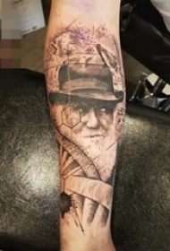 男生手臂上黑白点刺技巧生动的人物肖像和英文单词纹身图片