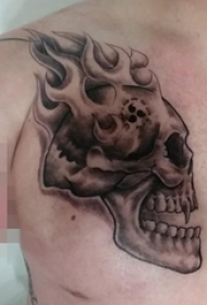 男生肩部黑白点刺几何元素骷髅头纹身图片
