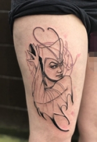 大腿上黑白灰风格点刺身抽象线条人物肖像纹身图片