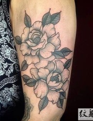 手臂一朵盛开一朵未开的浅黑灰色康乃馨纹身图案