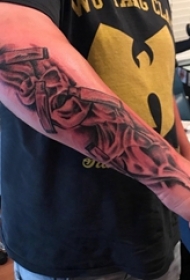 男生手臂上黑灰素描点刺技巧文艺唯美花朵纹身图片