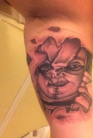 男生手臂上黑灰素描点刺技巧骷髅纹身图片