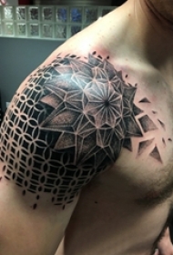 男生手臂上黑灰素描点刺技巧创意几何纹身图片