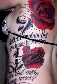 腰侧大红色玫瑰与英文纹身图片