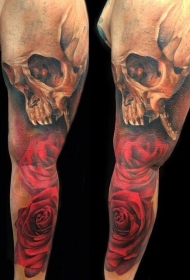 手臂彩色组合红玫瑰与人类头骨纹身图案